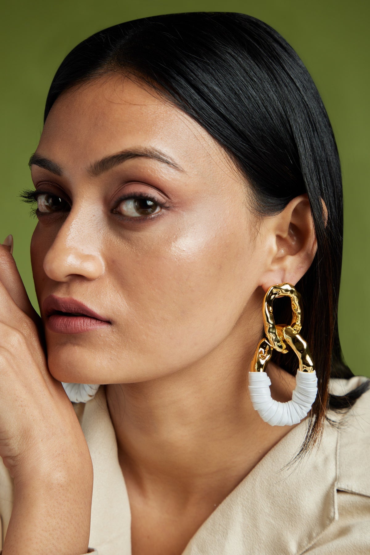 Our Astrik Earrings is an anti tarnish link earrings featuring a stylish white leather detail. These earrings combine the boldness of acrylic links with the softness of faux leather, creating a unique contrast that’s both edgy and sophisticated. Perfect for those who love to mix textures and make a statement, these earrings are versatile enough to complement anything from casual denim to sleek evening wear.