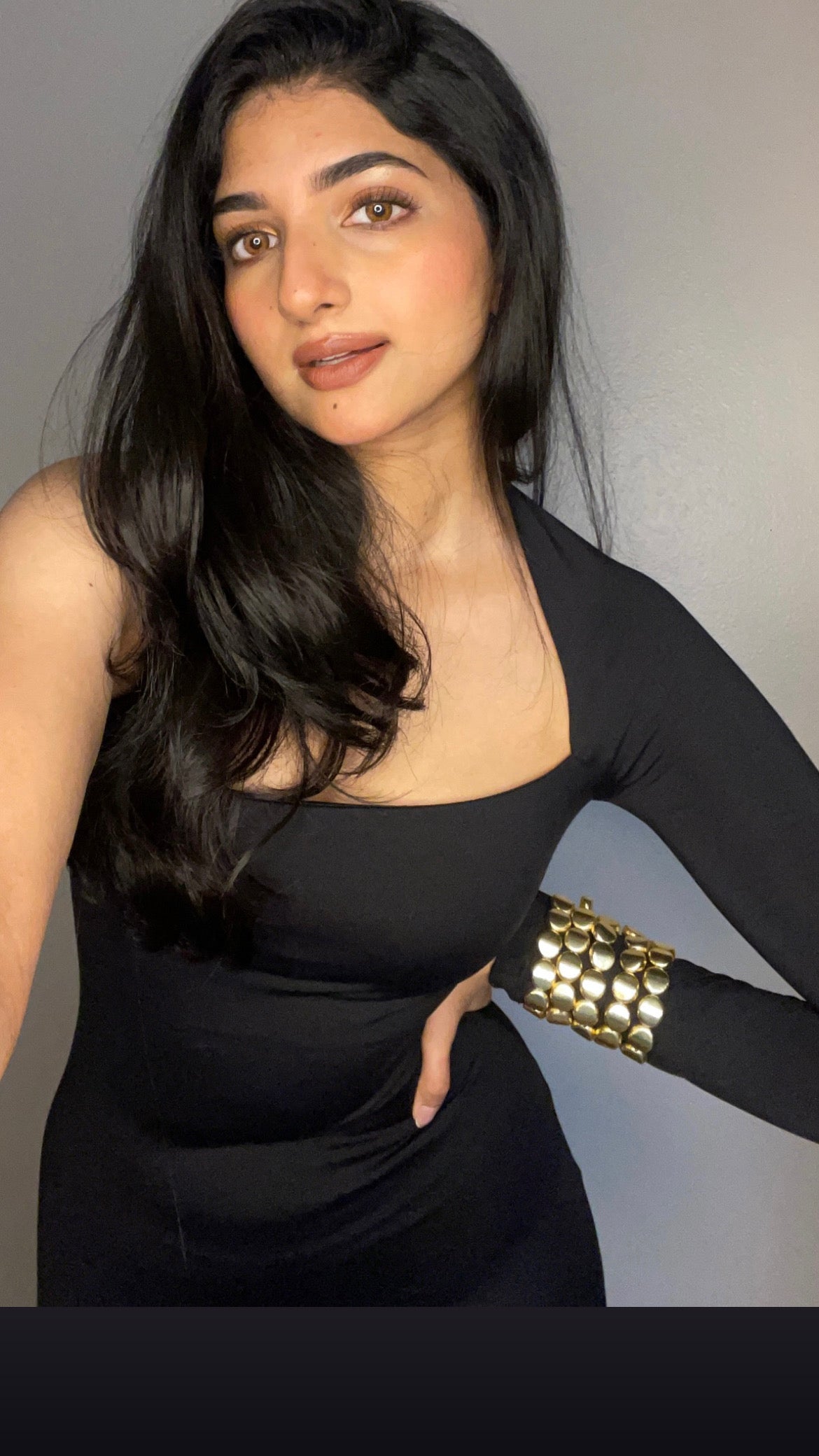 - Finished with Gold oval bracelet stack that gives it that soft, luxe glow