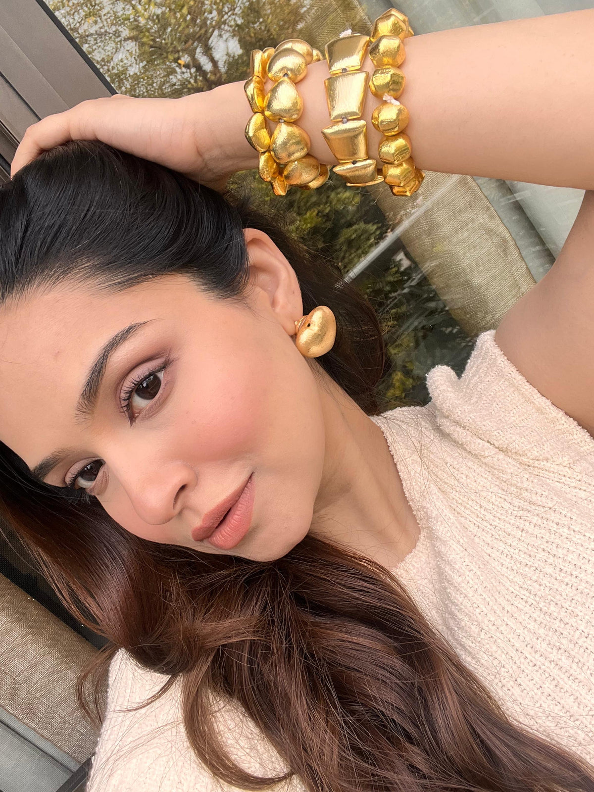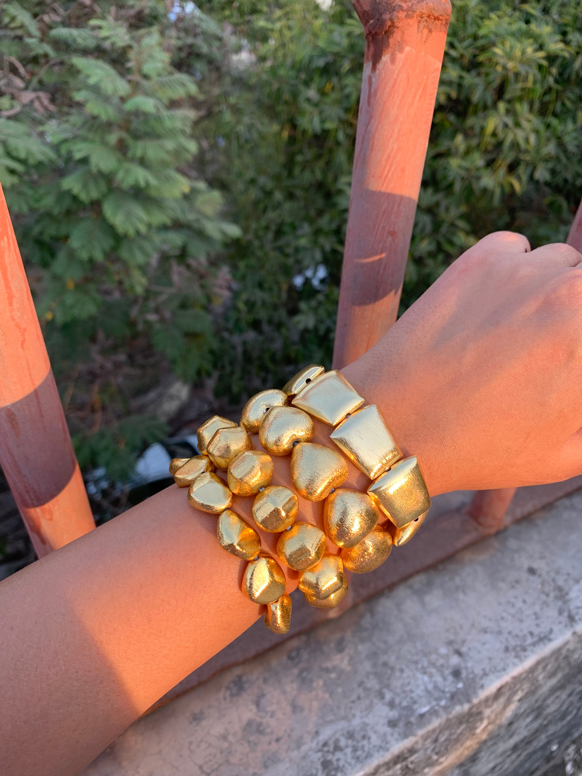 Elevate your accessory game with Mirage Si Stack - a set of 4 chunky brass bead elasticated stacks, featuring beads in various shapes for a unique and textured look. Each stack showcases a different design, creating a harmonious blend of styles that can be worn together or separately. The elasticated design ensures a comfortable fit, making these stacks easy to wear all day. Perfect for adding a touch of bold elegance to any outfit, these versatile bracelets are ideal for those who love mixing and matching their jewelry to create a personalized statement.