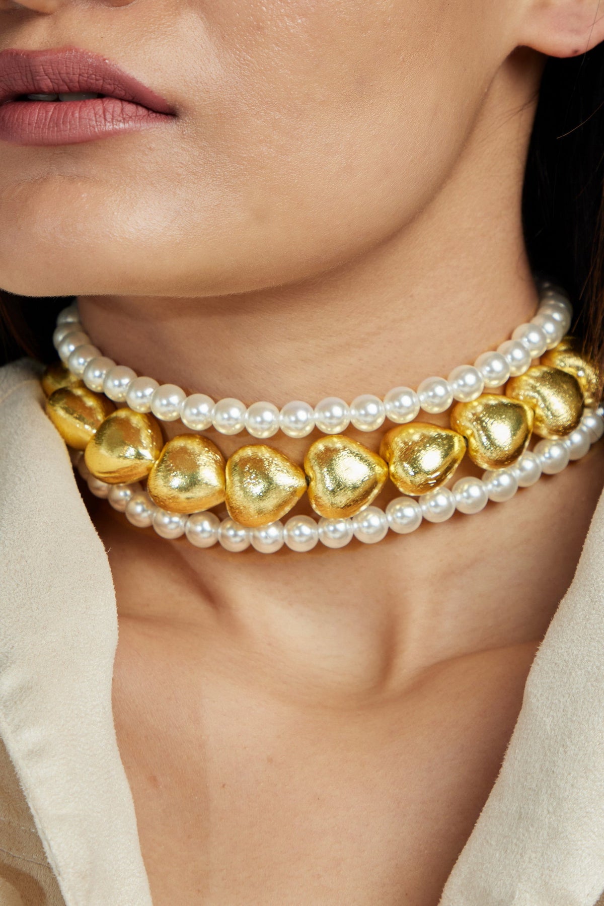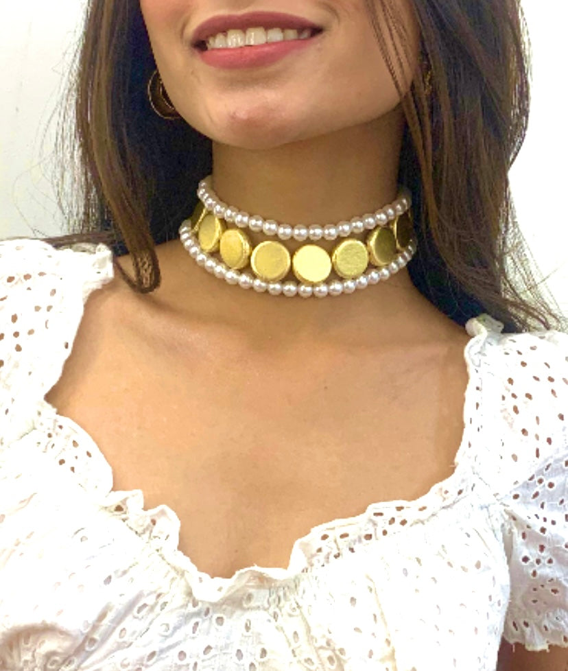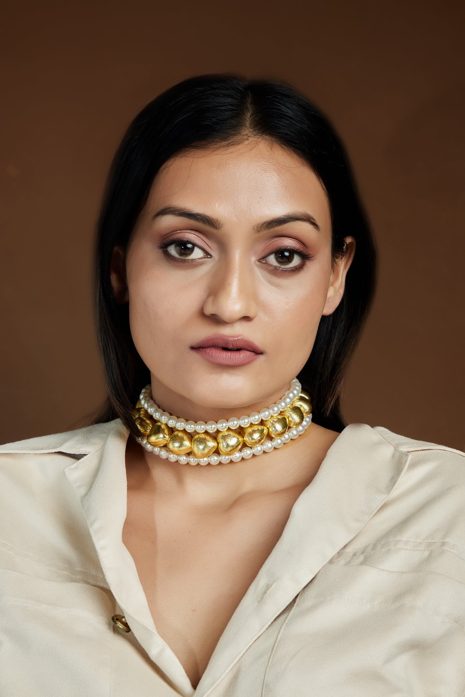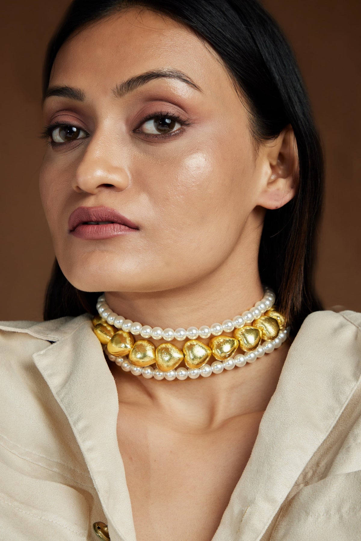 Discover the epitome of elegance with our three-layered pearl choker, available in two stunning variants. Each choker features a central layer adorned with heart-shaped or circled coiled accents, adding a unique and refined touch to the classic pearl design. The anti-tarnish polish ensures lasting beauty and durability, keeping the choker's shine intact for years to come. Perfect for enhancing both casual and formal ensembles, this choker combines timeless pearls with a modern twist, making it an essential piece for any jewelry collection. Choose your preferred shape and embrace a sophisticated style that reflects your individuality.