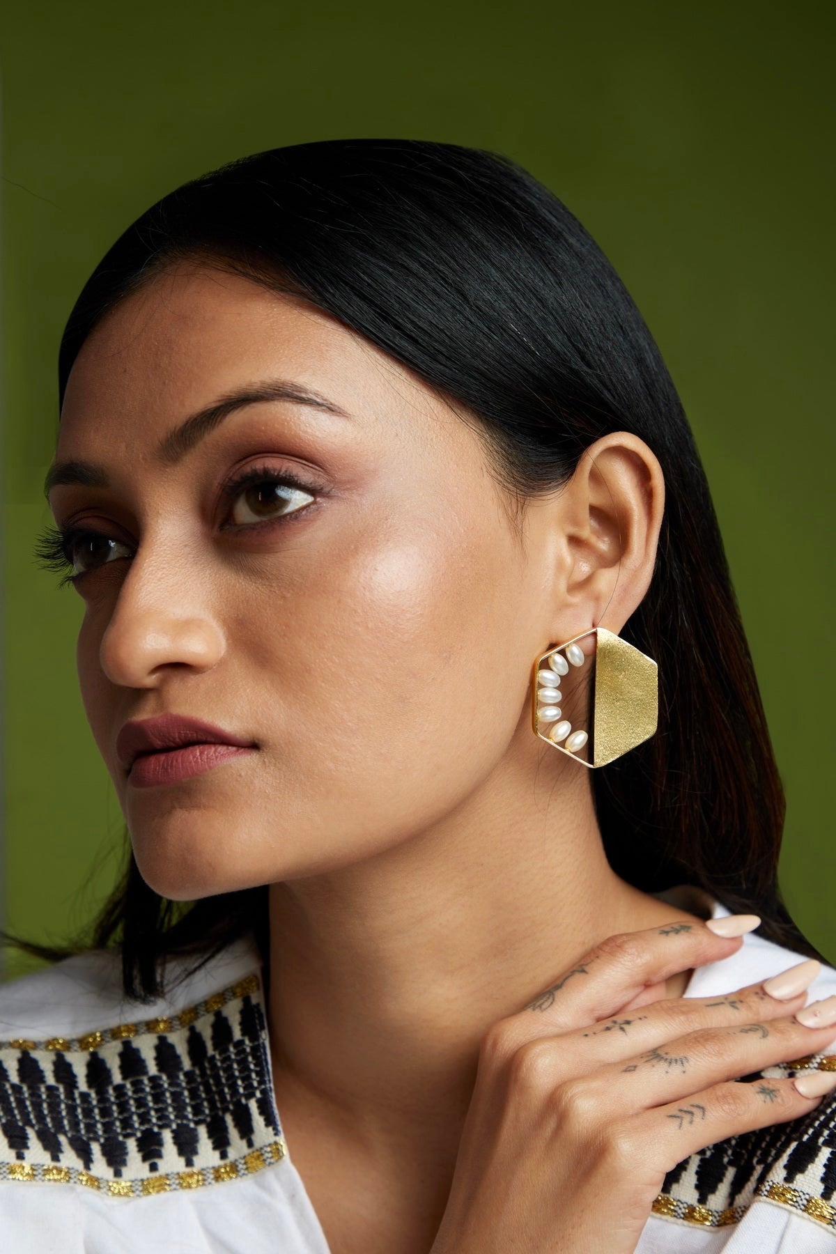 Introducing Lunar Earrings- a hexagon-shaped earrings, a perfect blend of modern geometry and timeless elegance. These earrings feature a unique design with one half crafted from sleek 18k gold-plated brass metal, while the other half showcases the organic beauty of baroque pearls. The contrasting textures create a striking visual balance, making these earrings a standout accessory for any occasion. The 18k gold plating adds a luxurious finish, while the baroque pearls offer a touch of natural elegance. Ideal for those who appreciate distinctive, artful design, these earrings are a true statement piece.