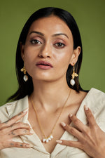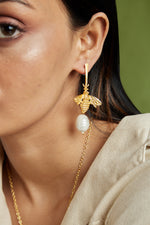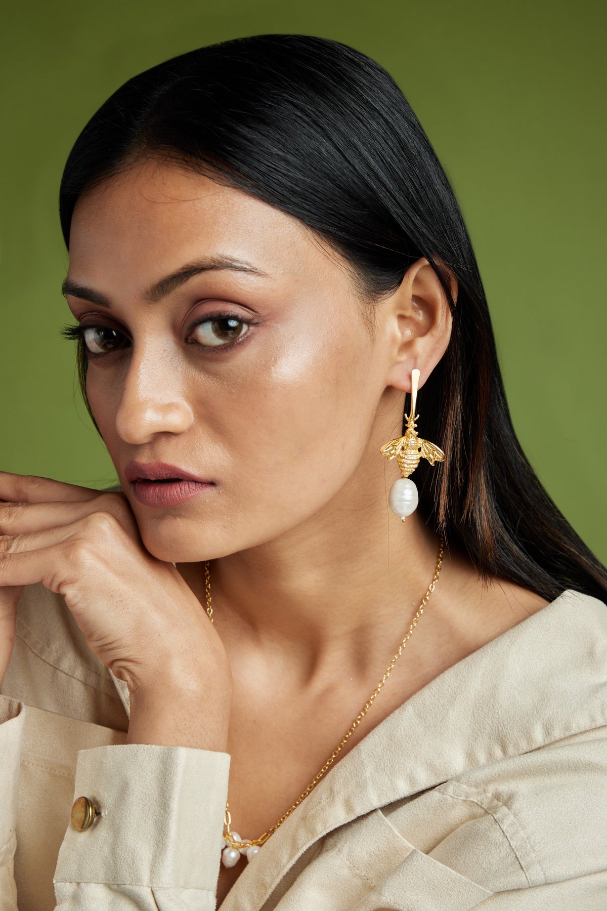 Add a touch of nature-inspired elegance with our Makhi Earrings - a honeybee-shaped brass danglers, beautifully crafted in 18k gold plating. Each earring features a detailed honeybee design, exuding charm and sophistication. Suspended below are lustrous baroque pearls, which add a graceful and organic element to the overall design. The combination of the golden honeybee and the natural beauty of the pearls creates a striking balance of whimsy and elegance, making these danglers perfect for both casual and formal occasions. These earrings are a delightful addition to any jewelry collection, offering a unique blend of luxury and nature.