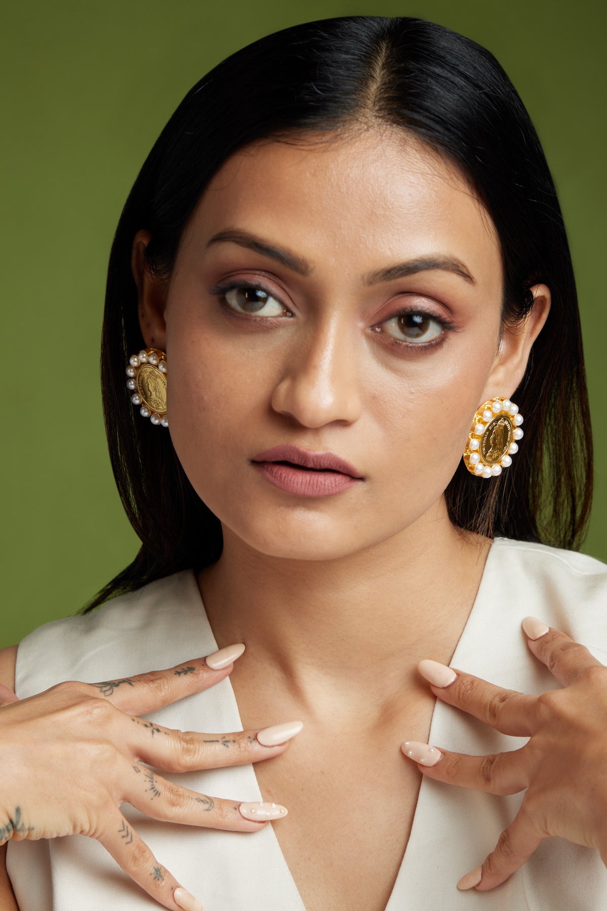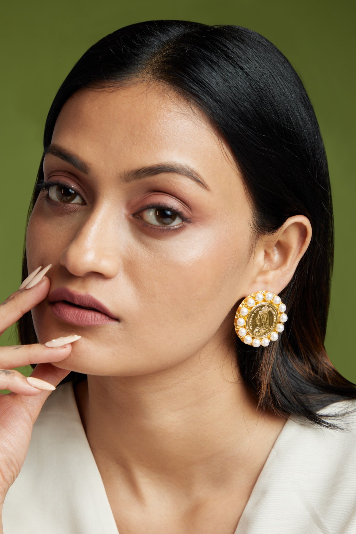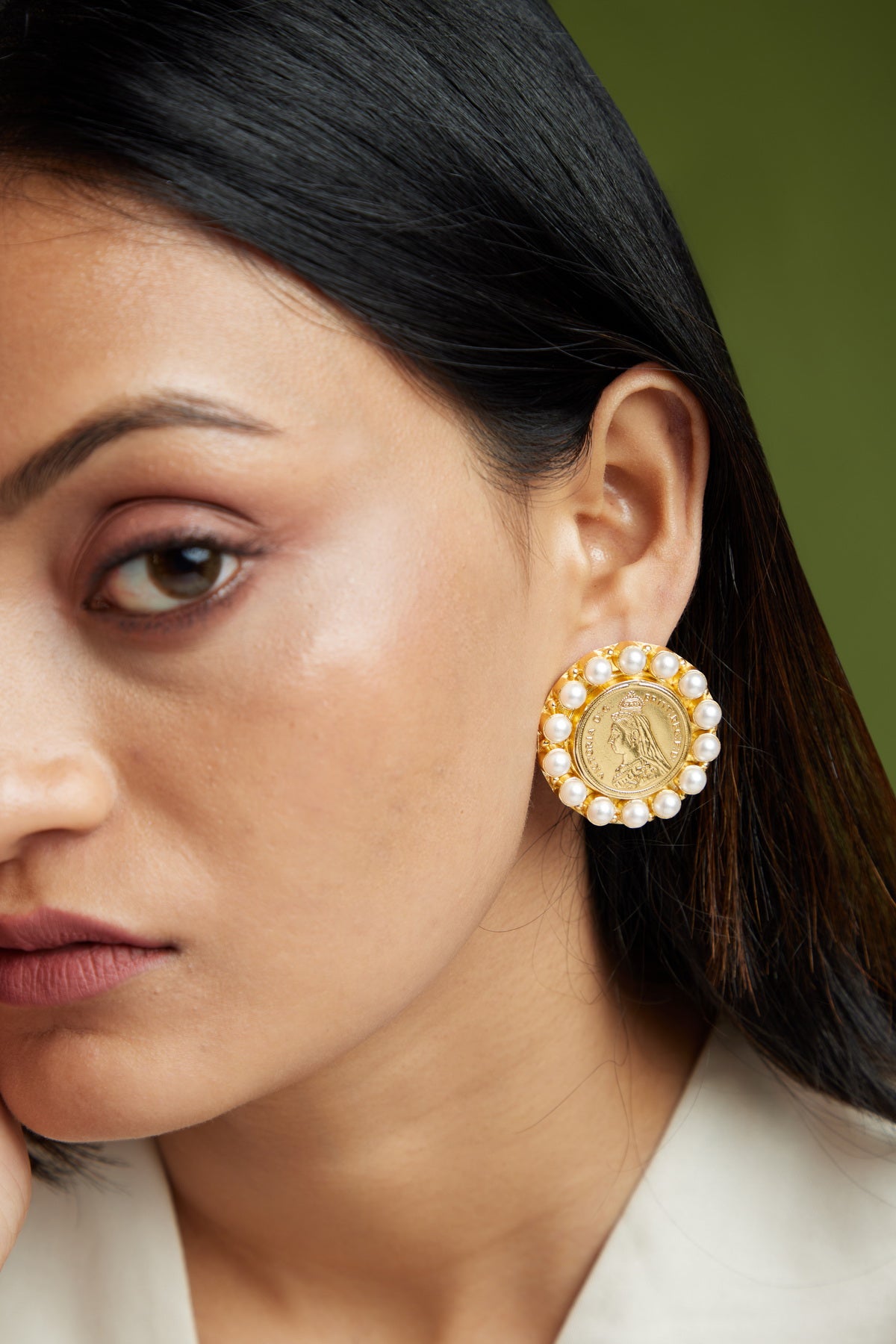 Step back in time with Moon Earrings - exquisite vintage coin studs, beautifully crafted from heavy quality brass and plated in 18k gold. Each stud features a classic English coin at its center, surrounded by a halo of lustrous baroque pearls that add an elegant touch of refinement. The rich gold plating enhances the antique charm of the design, while the sturdy brass construction ensures durability and weight, making these earrings both luxurious and substantial. Perfect for adding a touch of vintage sophistication to any outfit, these coin studs are a timeless piece that celebrates heritage and craftsmanship.