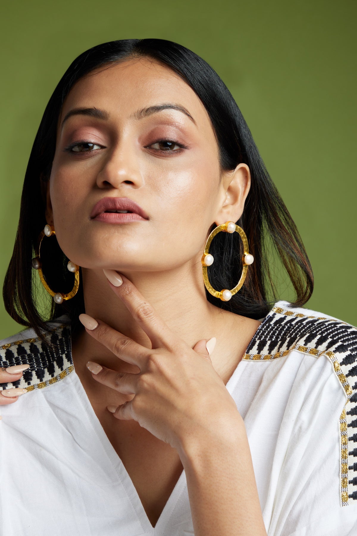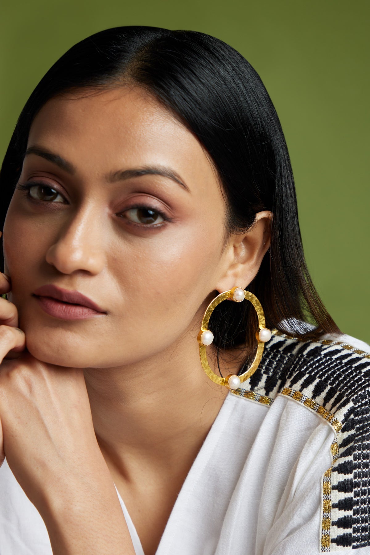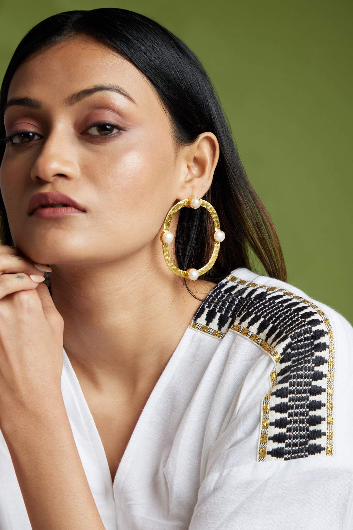 Our Arta Earrings strikes a cord between bold yet sophisticated with its hammered body studded with baroque pearls.