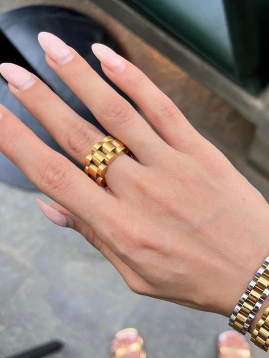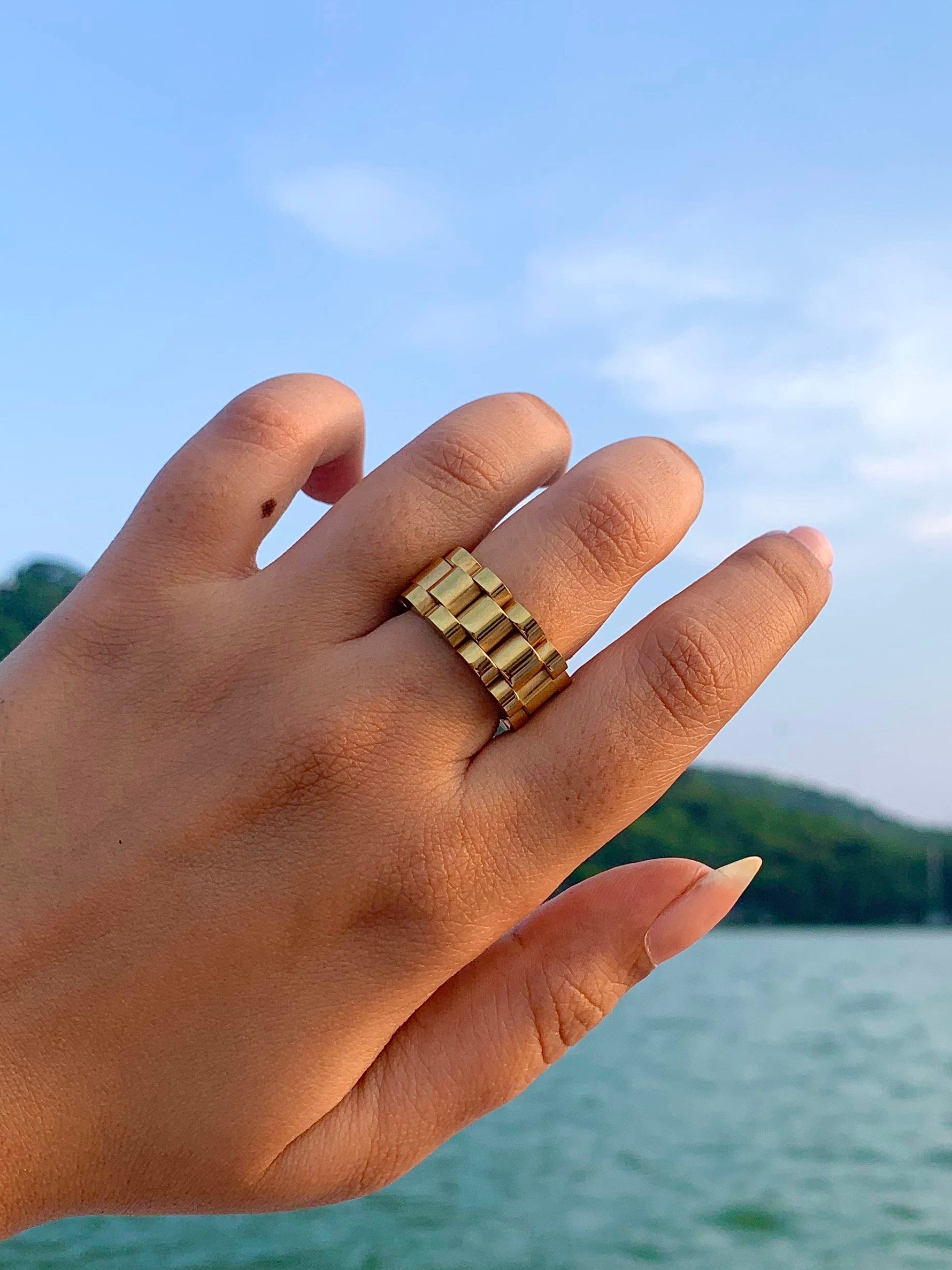 Our Fury Ring is a waterproof 18k gold plated watch strap link ring—a perfect fusion of luxury and practicality. Inspired by the classic design of watch strap links, this ring features a sleek, interlocking pattern that exudes sophistication and style. The 18k gold plating ensures a radiant shine, while its waterproof construction provides durability, making it ideal for everyday wear. Whether paired with your favorite watch or worn as a stand-alone piece, this ring adds a modern, elegant touch to any outfit, seamlessly blending fashion with function.