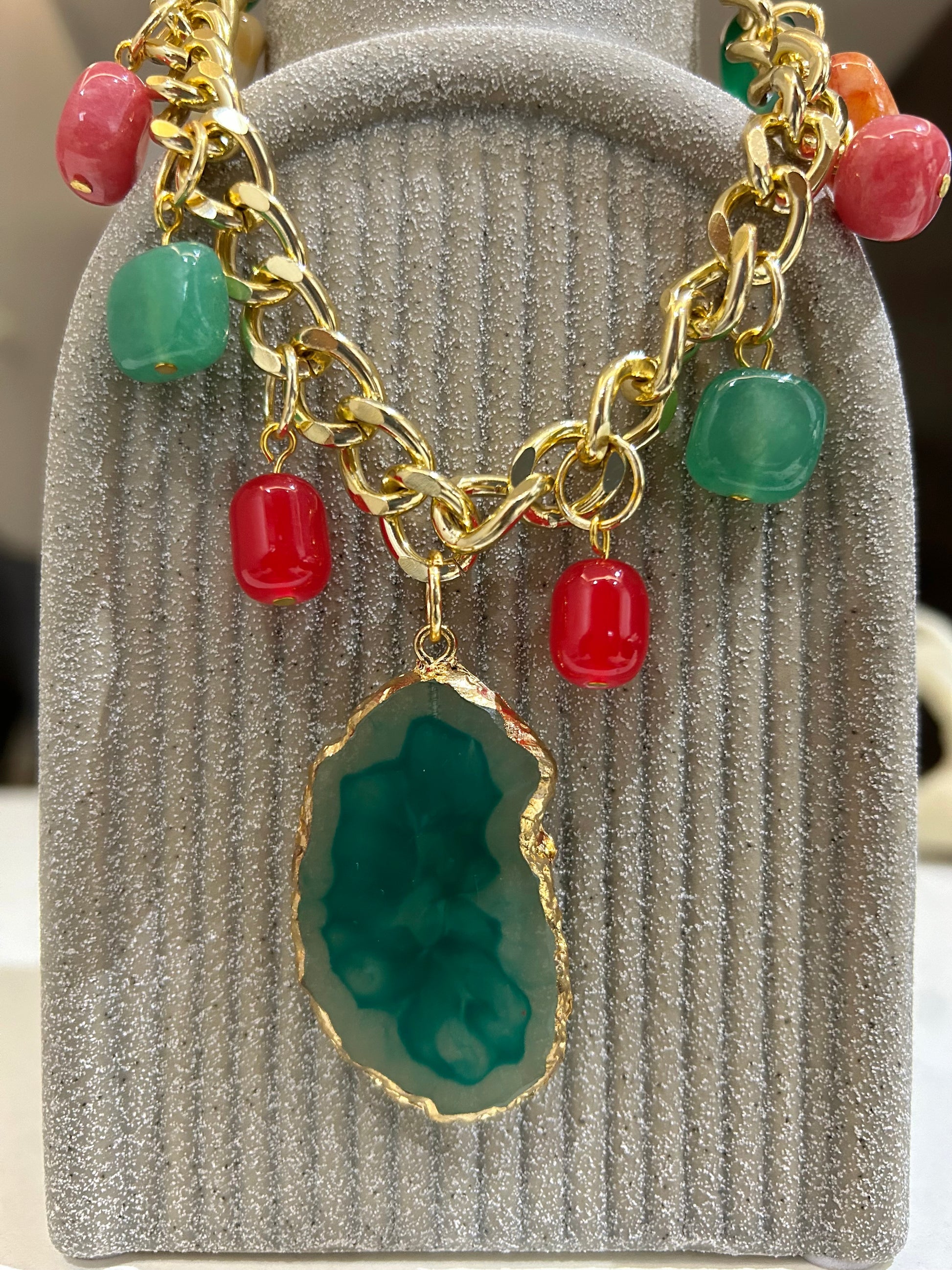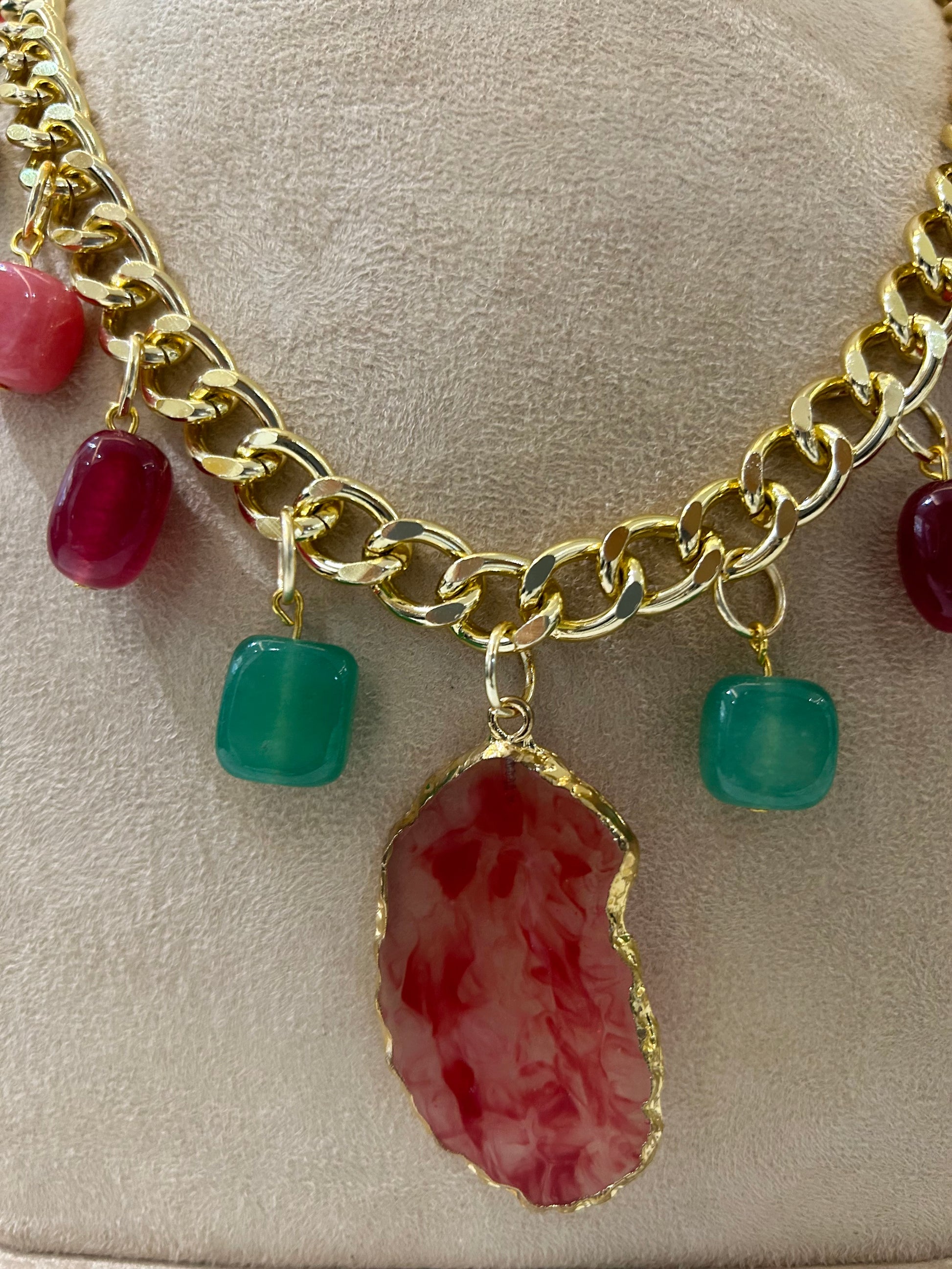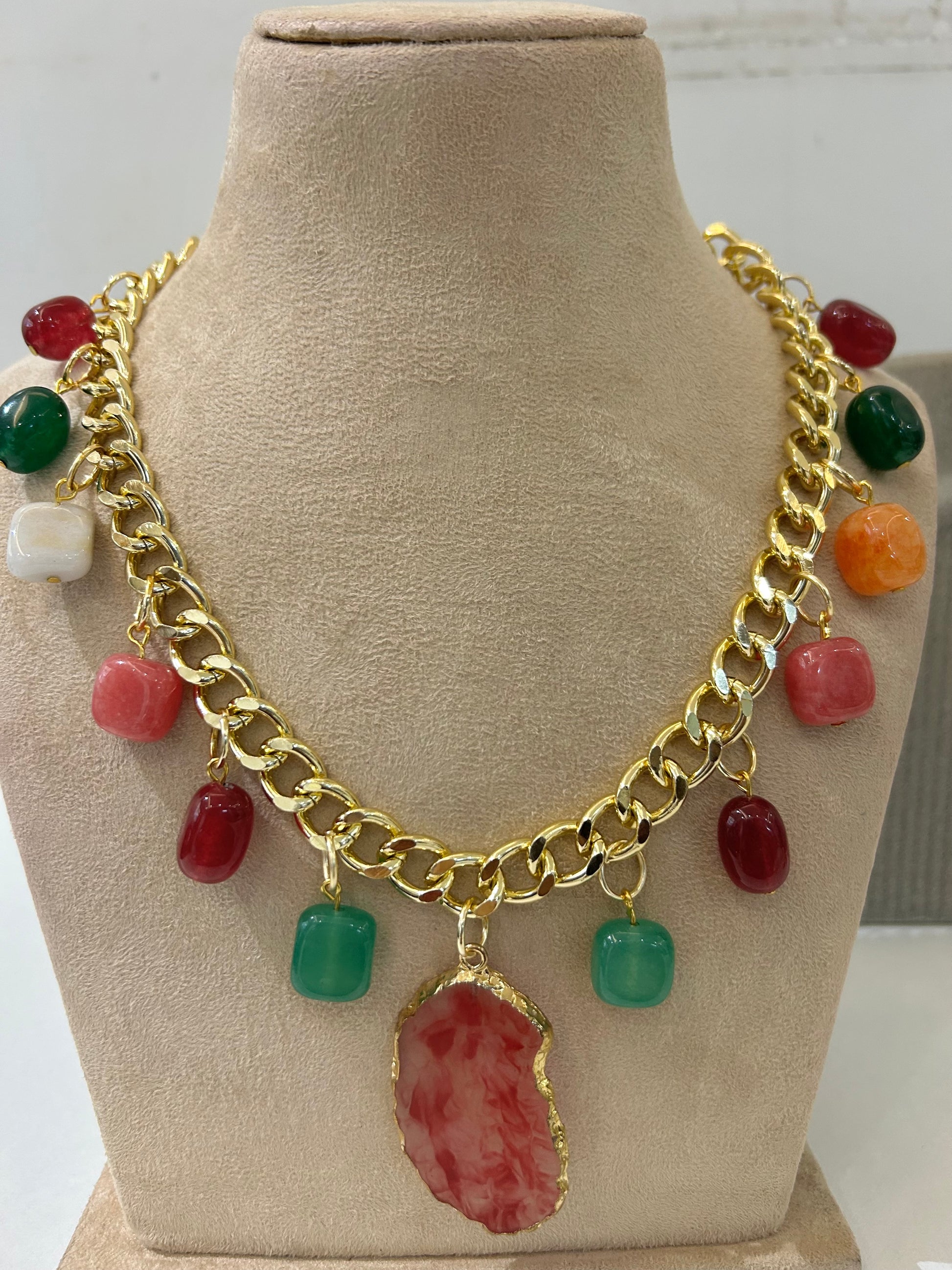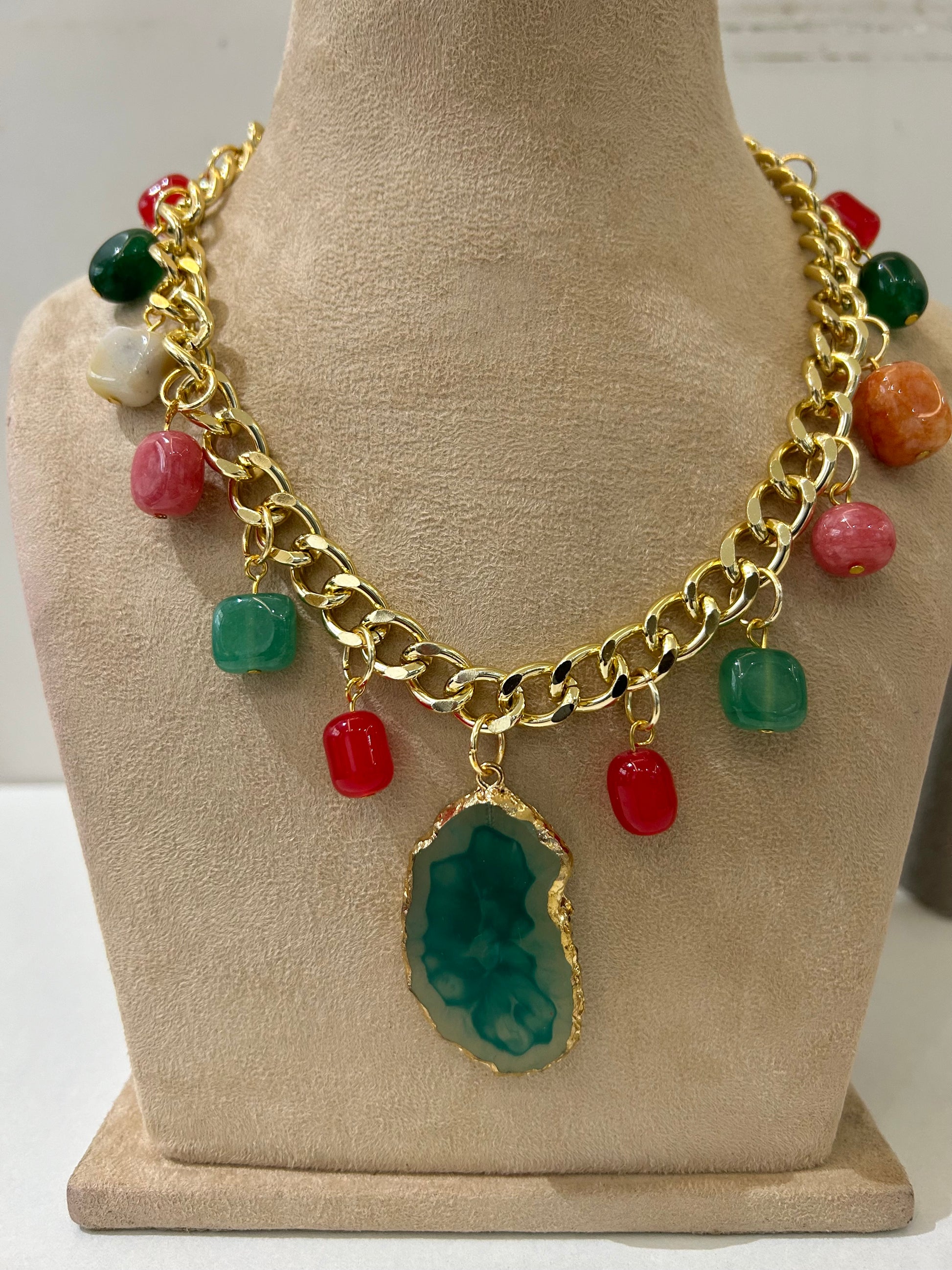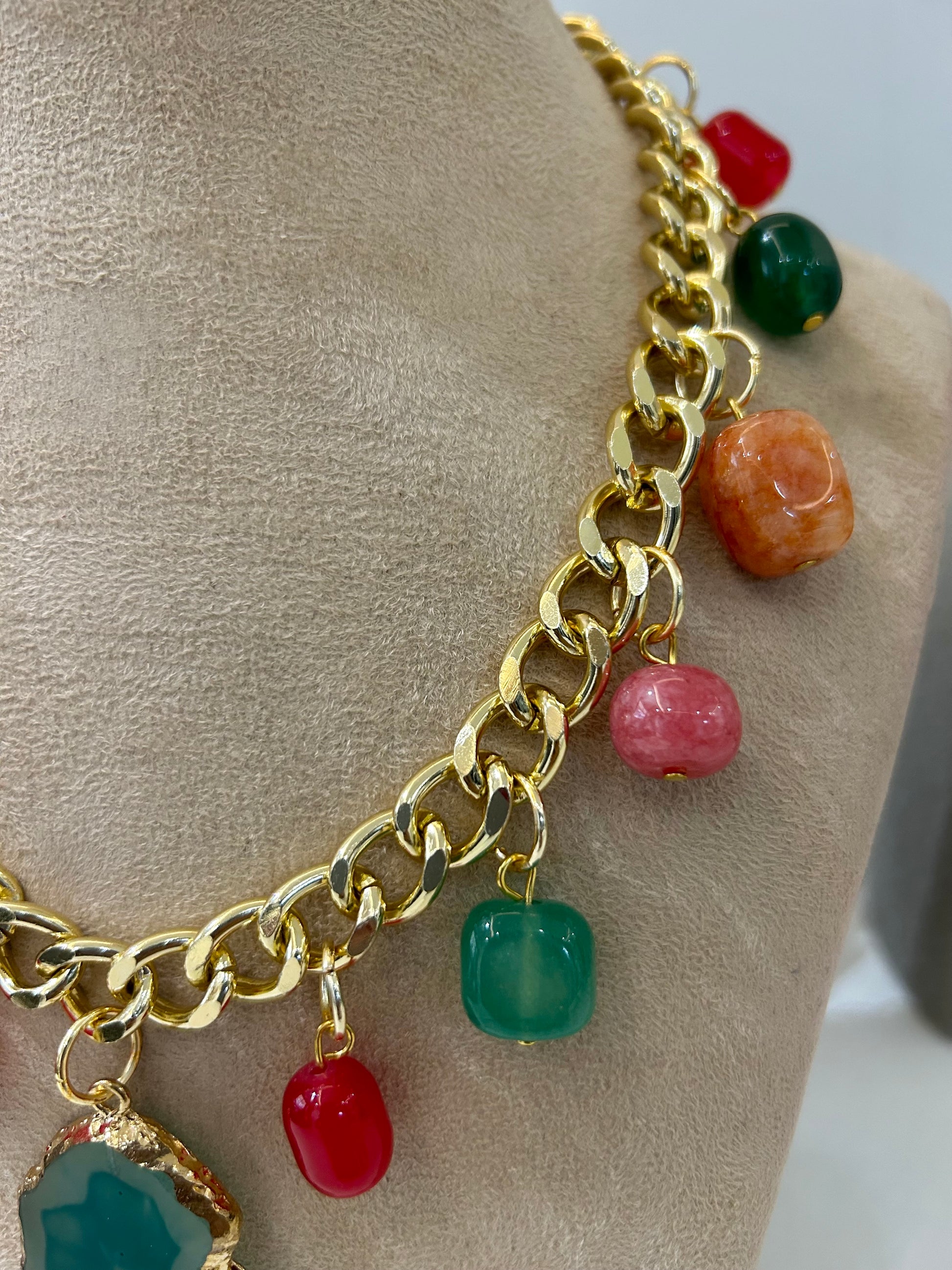 Our Celia Necklace is a stunning multicolored semi-precious beads charm necklace. Bursting with vibrant hues, each bead tells a story, adding a splash of color to your outfit. The necklace features an array of semi-precious drops with an acrylic center stone, each chosen for its unique charm and natural beauty. Perfect for wearing solo, this piece brings a playful yet elegant touch to any ensemble.