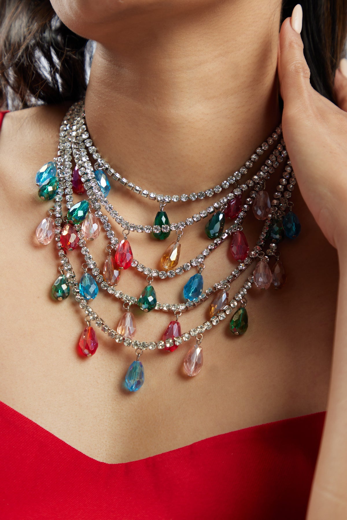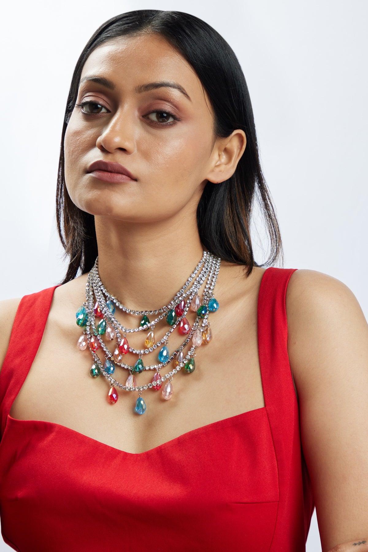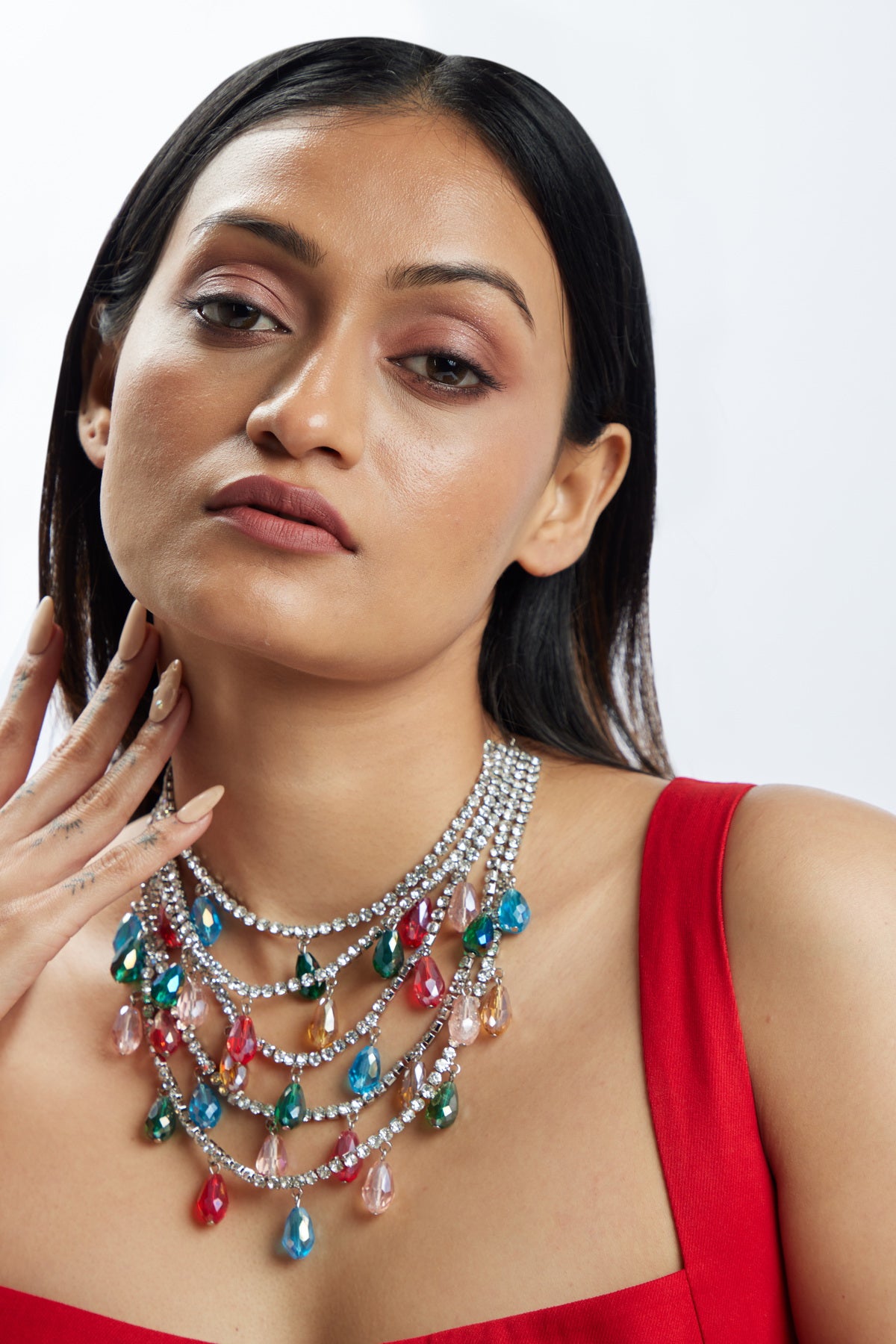 Dazzle in sophistication with this 5-layered rhinestone necklace, Mayara Necklace- featuring elegantly hanging semi-precious onyx beads. The intricate layers of sparkling rhinestones create a mesmerizing cascade, while the rich, deep tones of the onyx beads add a touch of luxury and mystery. Perfect for making a statement at special events or adding a glamorous accent to your evening attire, this necklace offers a stunning blend of sparkle and sophistication. Whether worn alone or paired with complementary pieces, it’s an essential addition to any jewelry collection, exuding timeless elegance and modern charm.